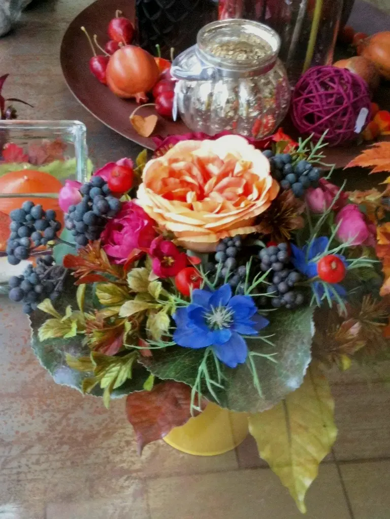 Beeren in lila, orange, rot, weiß und blau. Runde, dicke Dahlien und bunte Chrysanthemen mit fedrigen Gräsern und buntem Herbstlaub. Kürbisse, Zieräpfel und Lampions...